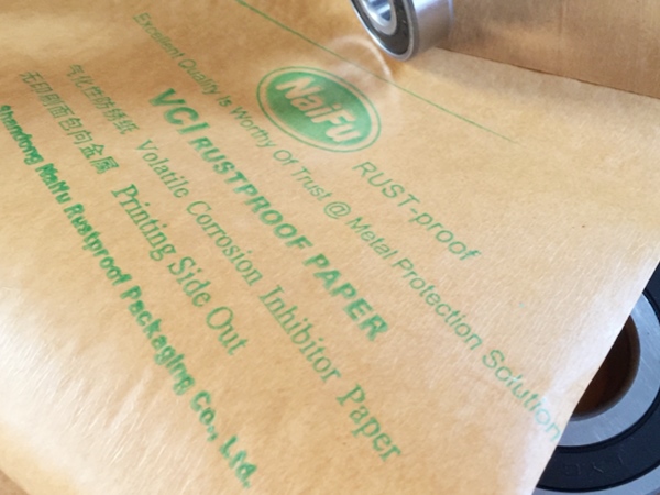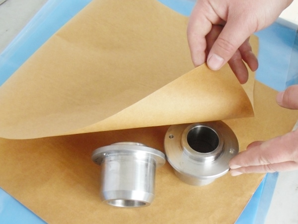 4、包裝過程---將含有緩蝕劑的面朝向金屬包裝,不覆膜防銹紙可作為金屬產(chǎn)品間墊層隔材使用,以免其他材質(zhì)阻隔材料含S、CL化學成分,影響防銹效果
